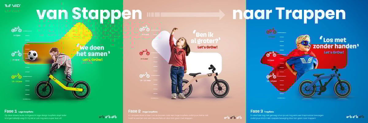Vici is er speciaal voor kinderen van 1 tot en met 5 jaar en biedt, door de ombouwmogelijkheid, één fiets voor de 3 verschillende fases die het kind doormaakt in het leren fietsen, of zoals wij zeggen: ‘’van stappen naar trappen!’’